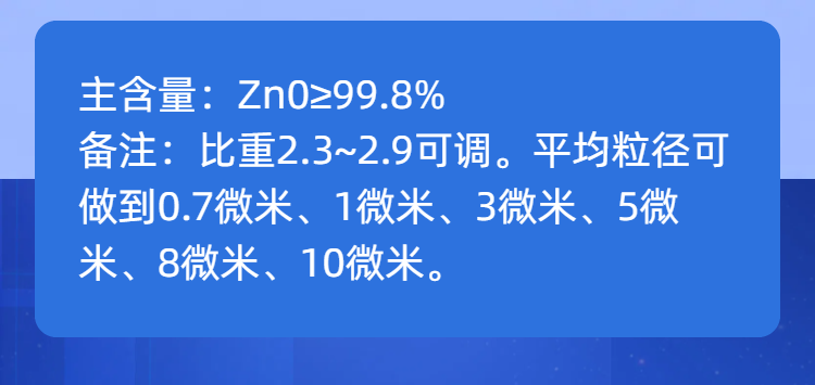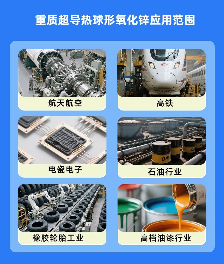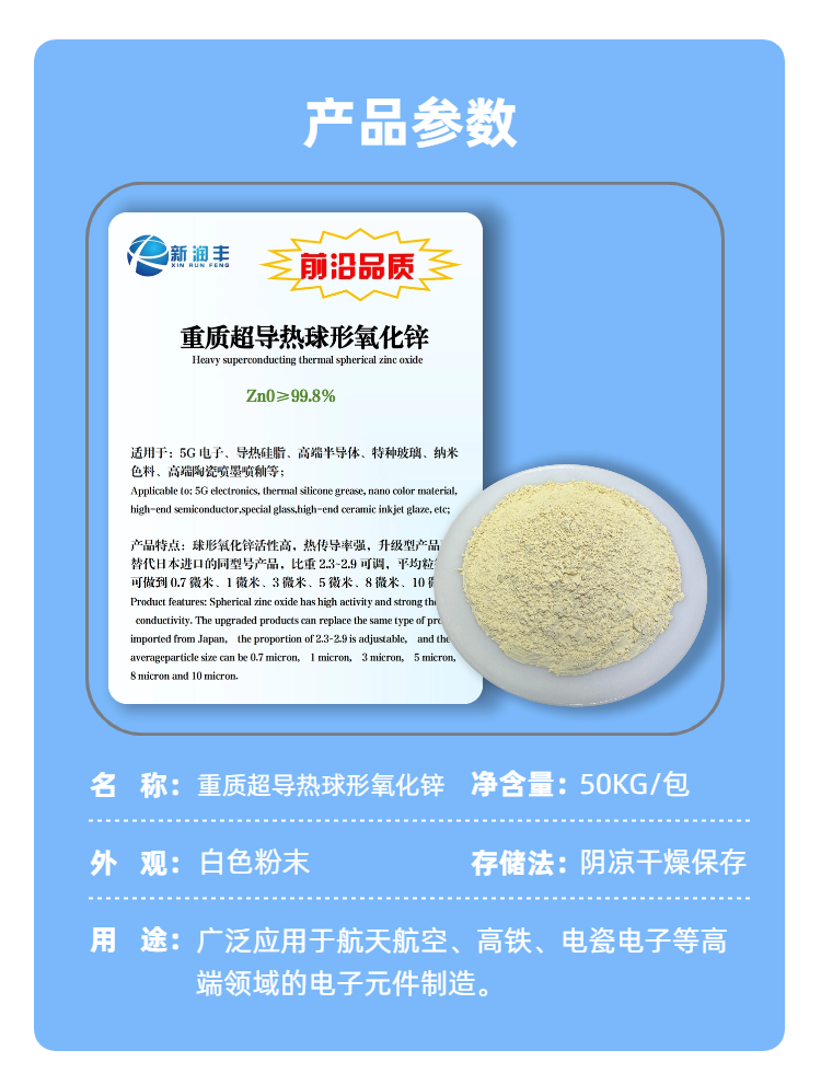 作用:添加重質超導熱球形氧化鋅到橡膠、塑料、硅脂里面,具有超導熱效果;應用于高端陶瓷廠、釉料廠、色料廠、電子硅膠、5G電子級、高級電阻片、高級避雷針等高端領域。