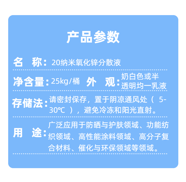 20納米氧化鋅分散液是由肇慶市新潤豐高新材料有限公司采用高能球磨和液相化學(xué)法結(jié)合精密分散技術(shù)制備而成的一款高性能納米材料分散液。本品將平均粒徑約為20納米的氧化鋅顆粒通過獨特的表面改性劑均勻、穩(wěn)定地分散在水性介質(zhì)中,形成奶白色的均一分散體系。該產(chǎn)品有效解決了納米粉體易團(tuán)聚、難分散的行業(yè)難題,使用者可直接、高效地利用納米氧化鋅的優(yōu)異特性,輕松將其添加到各種基體材料中。
