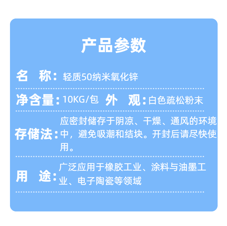 本產(chǎn)品是由肇慶市新潤(rùn)豐高新材料有限公司采用低溫可控化學(xué)沉淀法制備的高純度納米氧化鋅。其平均一次粒徑嚴(yán)格控制在50納米左右,具備典型的六方纖鋅礦晶體結(jié)構(gòu)、較高比表面積及良好的分散性能。產(chǎn)品為白色疏松粉末,廣泛應(yīng)用于橡膠、涂料、電子、陶瓷等領(lǐng)域,作為高性能功能性添加劑,可顯著提升終端產(chǎn)品的力學(xué)性能、抗菌性、紫外屏蔽性和電學(xué)特性。